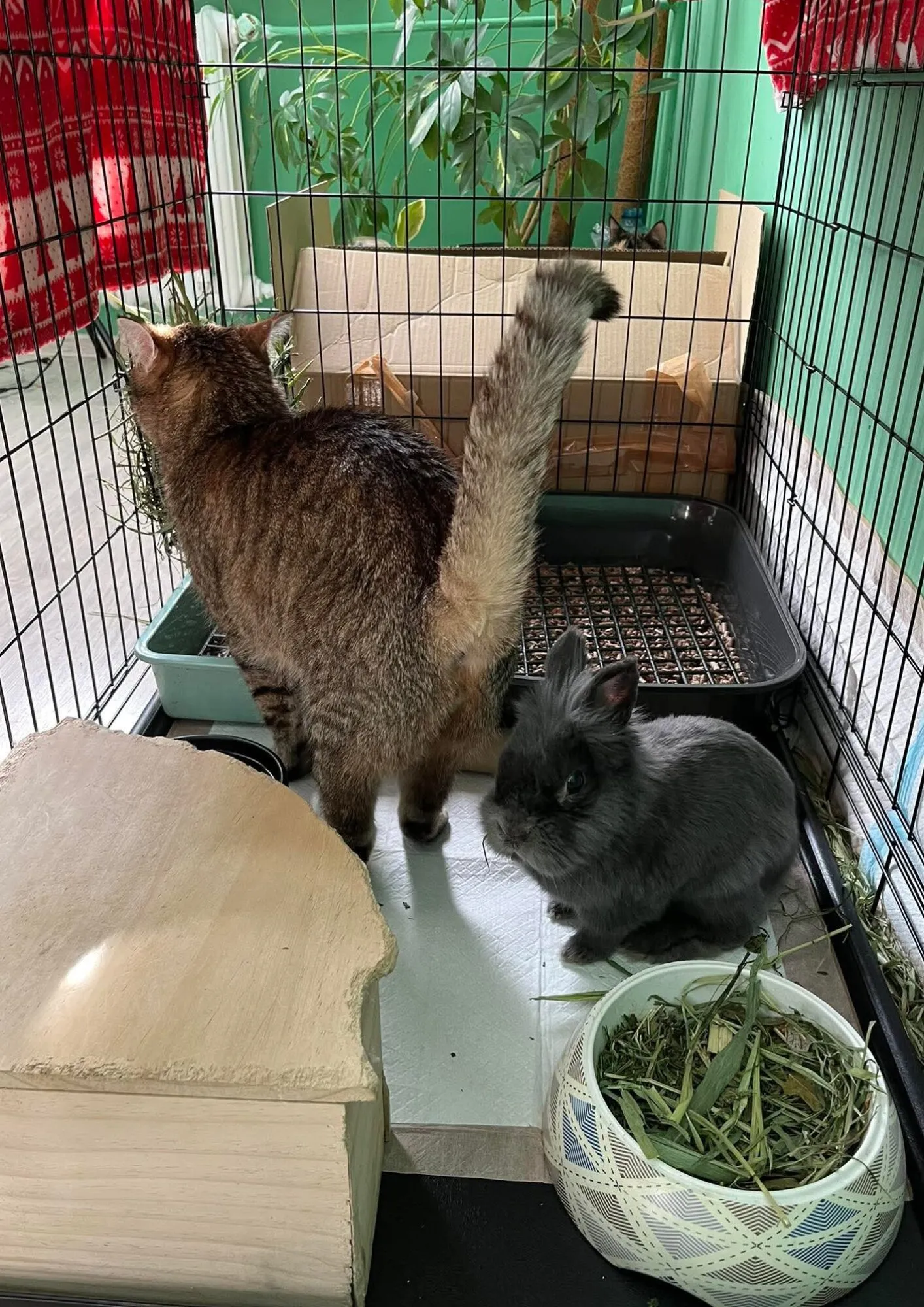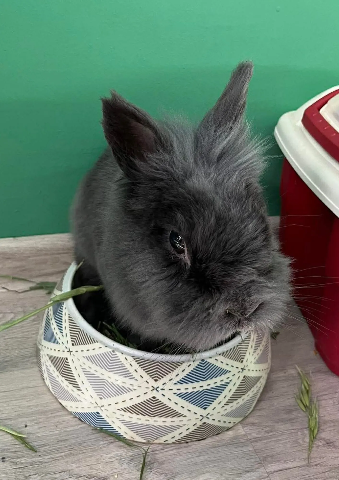 Gerard jest dosyć nieśmiałym królikiem, raczej nie opuszcza swojej klatki, nie umie chodzić po panelach. Daje się pogłaskać i bardzo to lubi, ale nie jest tym typem, który robi pierwszy krok. 🙂