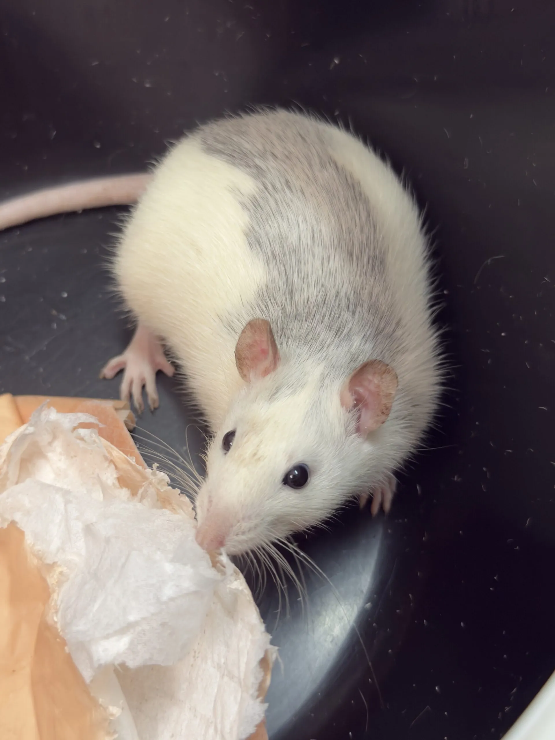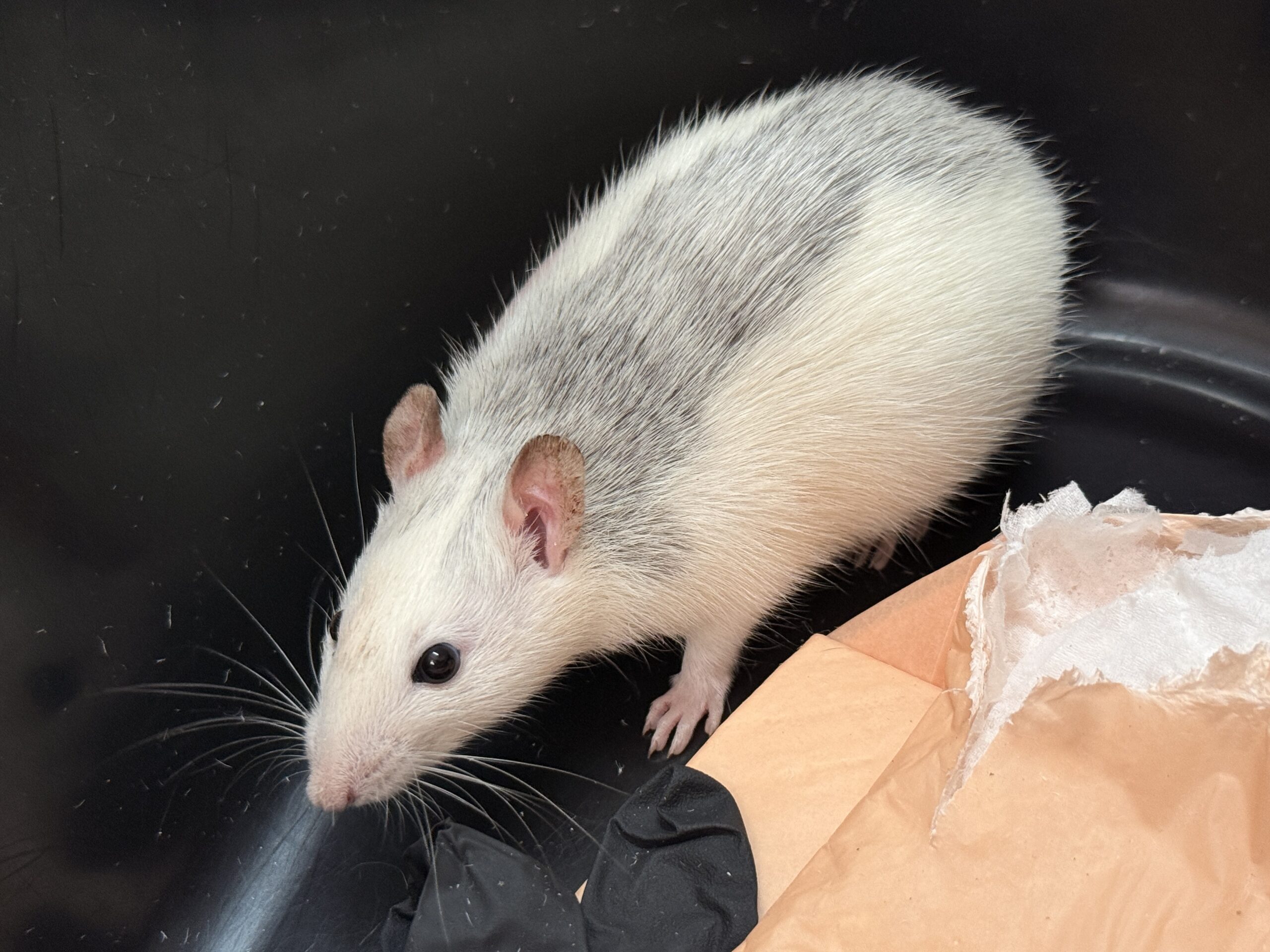 Winiary (samica w typie husky) – złapała się jako druga, strachliwa, ale szczurze towarzystwo dodaje jej odwagi.