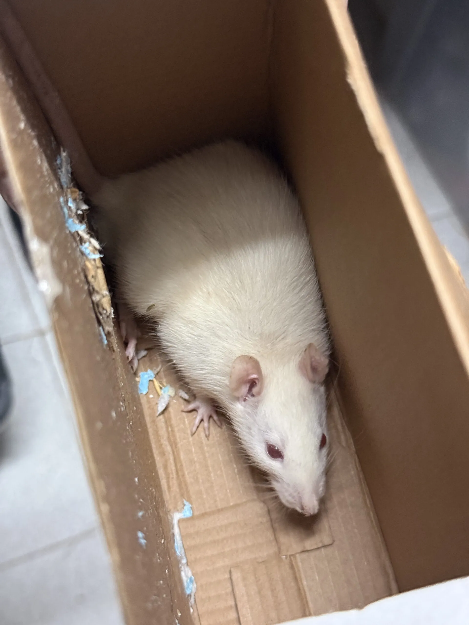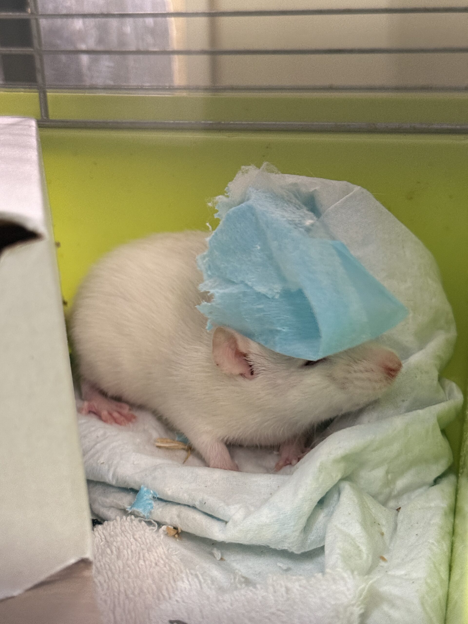 Owolowo (samiec w różowej klatce i kartonie) – najbardziej wycofany, rzadko kiedy wychodzi ze swojej kryjówki.